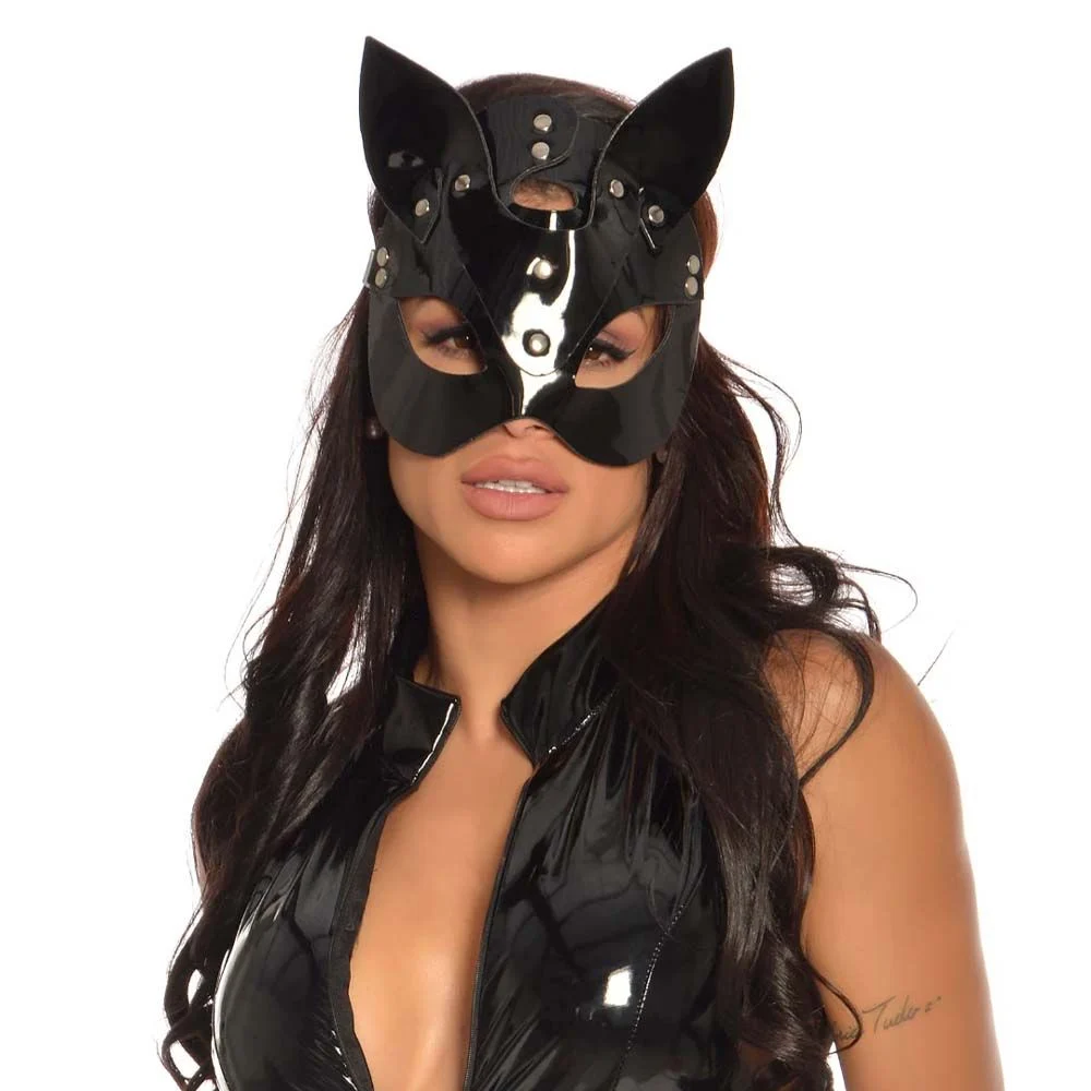 Estilo e Sensualidade: O vinil brilhante e o design provocante tornam esta máscara uma peça central de qualquer look sensual.